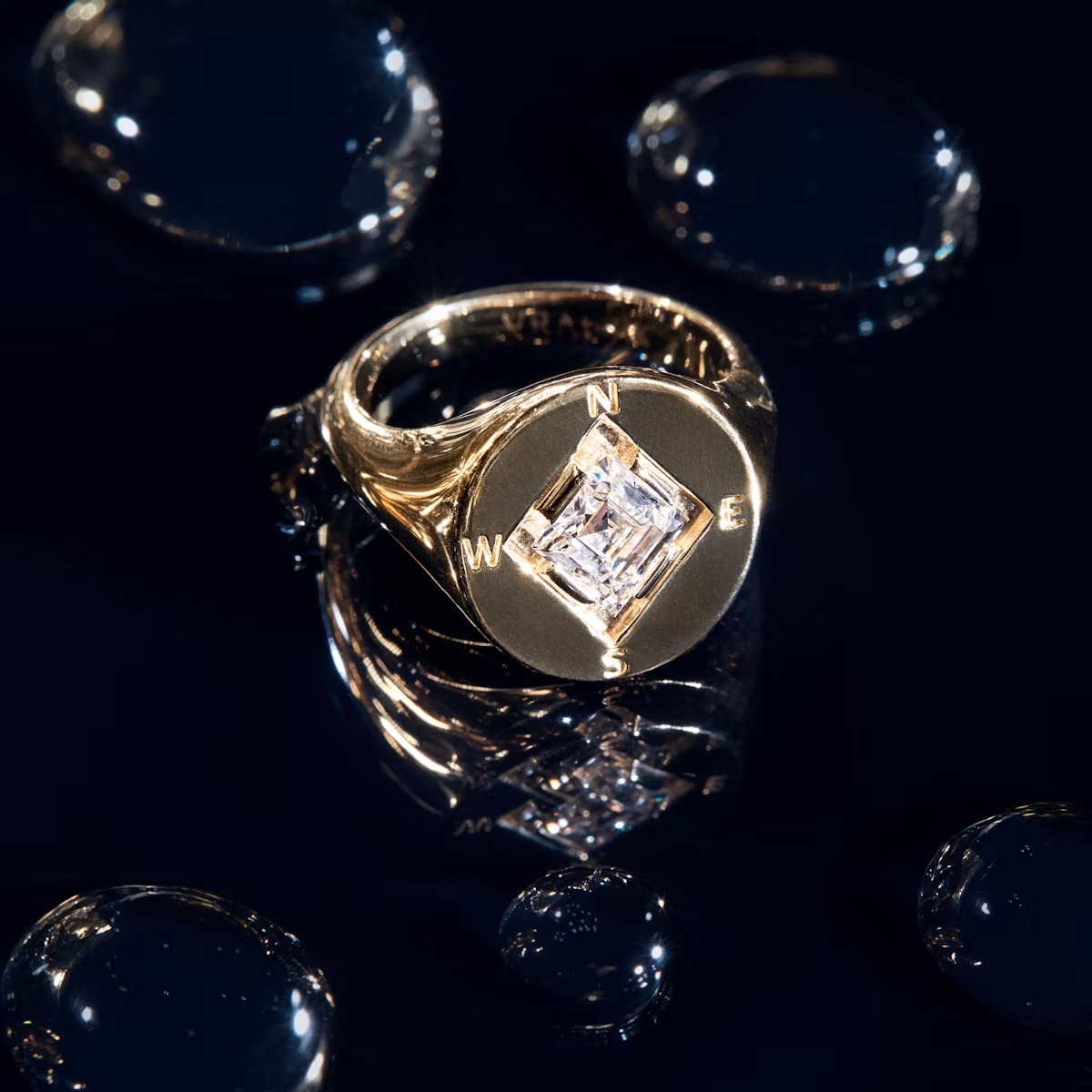 With a compass inscription to guide you, let our VRAI created, lozenge cut diamond set in 14k gold move you toward your aspirations.